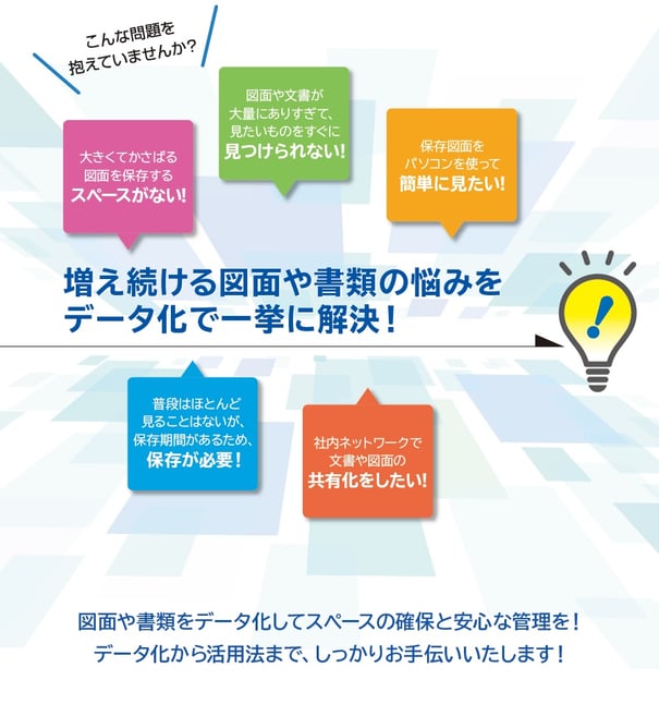 社内や工場に保管してある部品図・設計図などの図面や社内報などの紙書類をデータ化することで、さまざまな困りごとを一挙に解決できます。